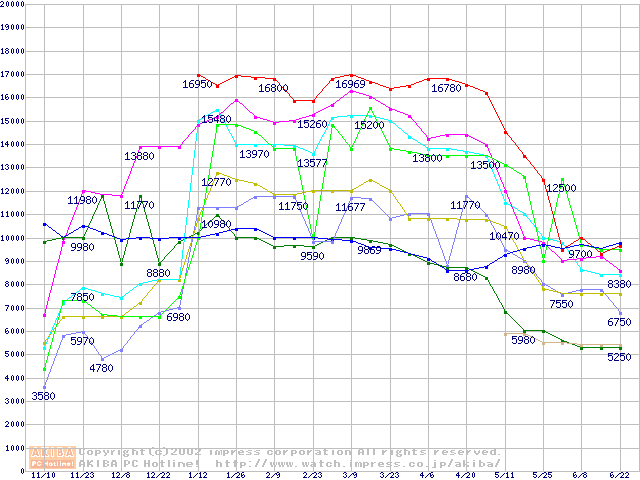 メモリ主要製品(最安値5千円~1万円未満)の最安値推移