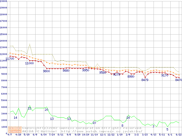 WD Caviar (7200rpm,UltraATA/100,20GB/Platter)の最安値推移