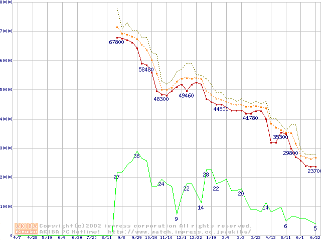 Socket 478 (micro-PGA,FSB 400MHz,L2 256KB,Willamette)の最安値推移