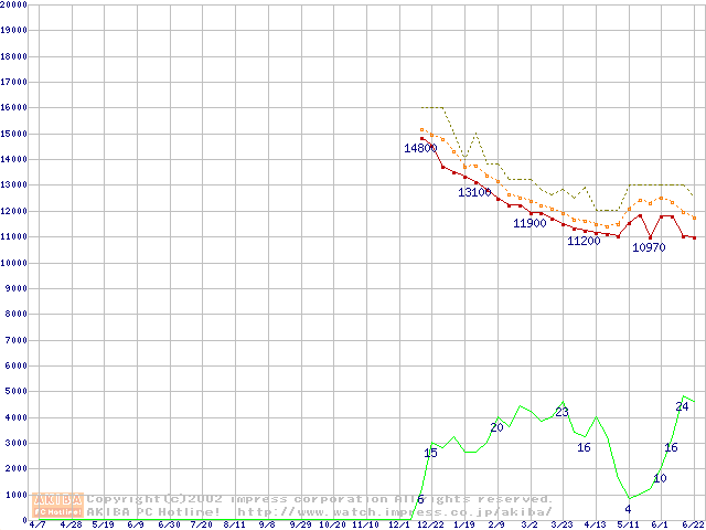 Travelstar 40GN (9.5mm,4200rpm,UltraATA/100,20GB/Platter,2MB,流体軸受)の最安値推移