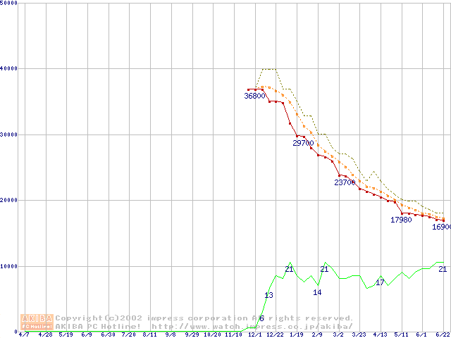 Travelstar 40GN (9.5mm,4200rpm,UltraATA/100,20GB/Platter,2MB,流体軸受)の最安値推移