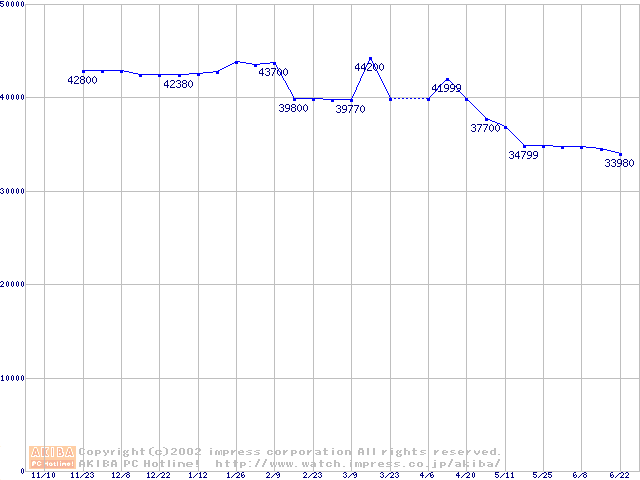 | [↑前グラフ]: | Travelstar 60GH (12.5mm,5400rpm,UltraATA/100,15GB/Platter,2MB,流体軸受)の最安値推移 |