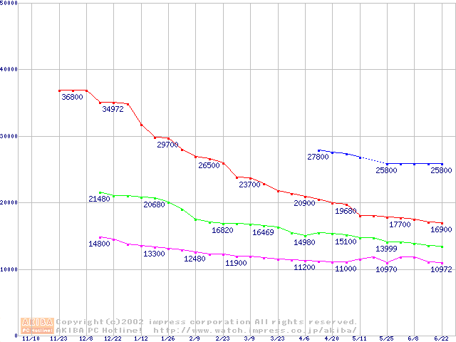 | [↑前グラフ]: | Travelstar 40GNX (9.5mm,5400rpm,UltraATA/100,20GB/Platter,8MB,流体軸受)の最安値推移 |