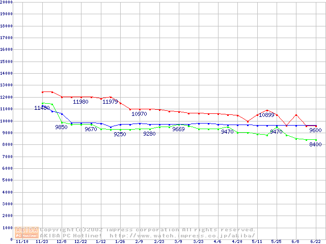 | [↑前グラフ]: | Travelstar 40GN (9.5mm,4200rpm,UltraATA/100,20GB/Platter,2MB,流体軸受)の最安値推移 |