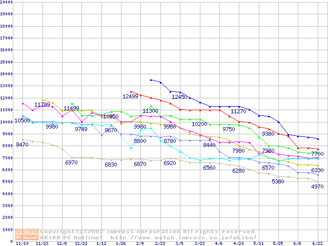 | [↓次グラフ]: | Socket A (Spitfire,PGA,FSB 200MHz,L2 64KB)の最安値推移 |