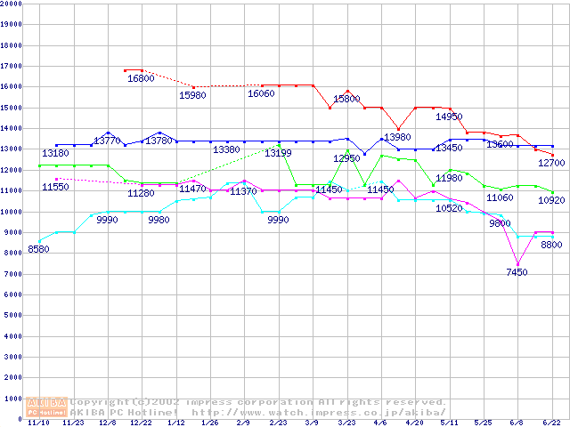 | [↑前グラフ]: | Socket A (Thunderbird,PGA,FSB 266MHz,L2 256KB)の最安値推移 |