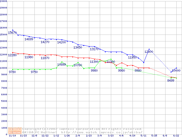 | [↑前グラフ]: | Deskstar 120GXP (7200rpm,UltraATA/100 2MB)の最安値推移 |