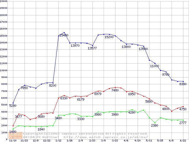 | [↓次グラフ]: | PC133 SDRAM DIMM CasLatency=3 ECC対応の最安値推移 |