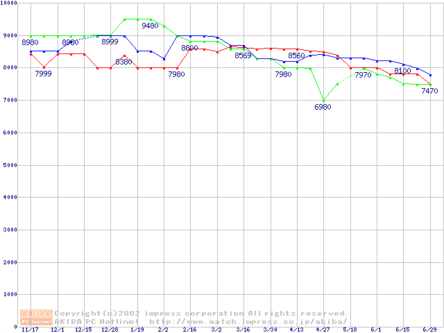 | [↑前グラフ]: | HDD 10GB~20GB未満(5400rpmクラス)の最安値推移 |