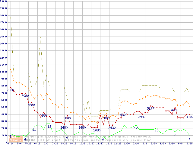 PC133 SDRAM DIMM CasLatency=3 ECC対応の最安値推移