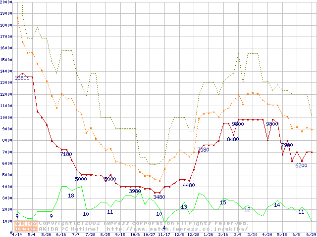 PC133 SDRAM DIMM CasLatency=3 ECC対応の最安値推移