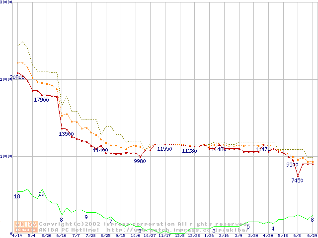 Socket A (Thunderbird,PGA,FSB 200MHz,L2 256KB)の最安値推移