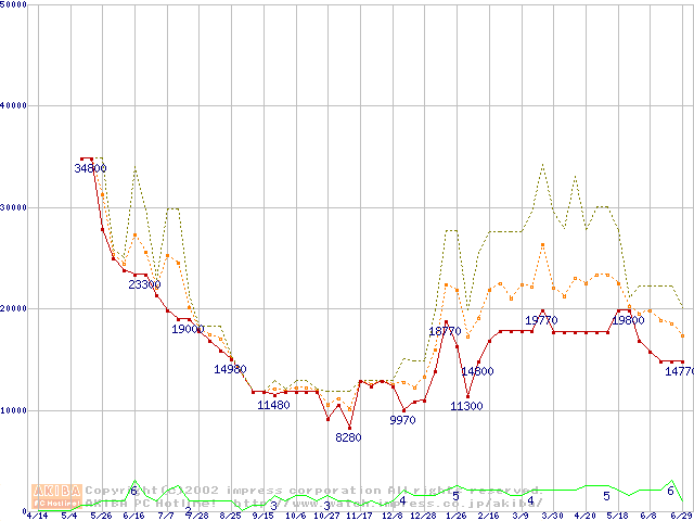 PC100 SDRAM DIMM CasLatency=2 ECC対応の最安値推移