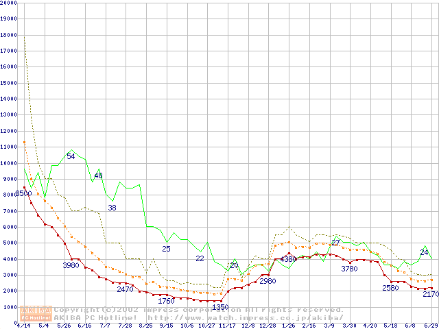 メモリ主要製品(最安値5千円未満)の最安値推移