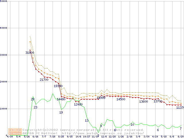 Socket A (Thunderbird,PGA,FSB 266MHz,L2 256KB)の最安値推移