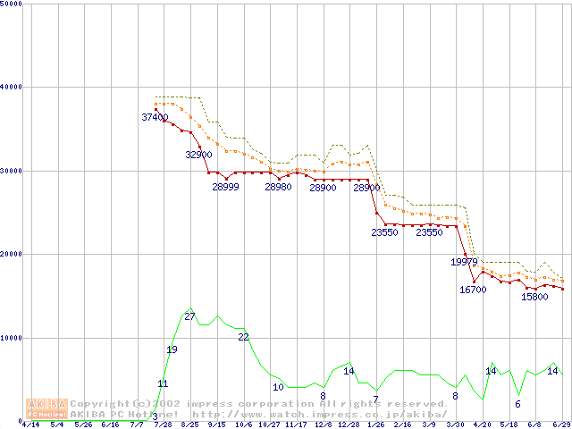 Socket 370 (FC-PGA2,FSB 133MHz,L2 256KB)の最安値推移