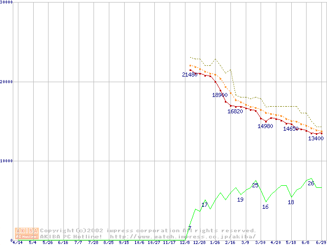 Travelstar 40GN (9.5mm,4200rpm,UltraATA/100,20GB/Platter,2MB,流体軸受)の最安値推移
