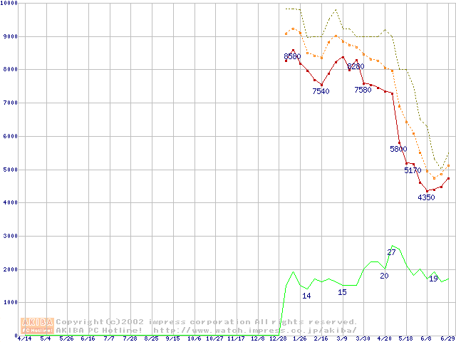 メモリ主要製品(最安値5千円未満)の最安値推移