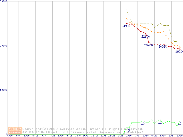 MHRシリーズ (9.5mm,4200rpm,UltraATA/100,2MB,20GB/プラッタ,流体軸受)の最安値推移