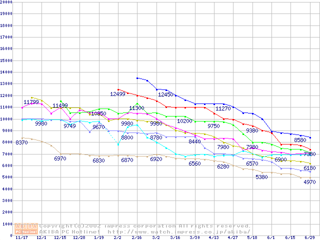| [↓次グラフ]: | Socket A (Spitfire,PGA,FSB 200MHz,L2 64KB)の最安値推移 |
