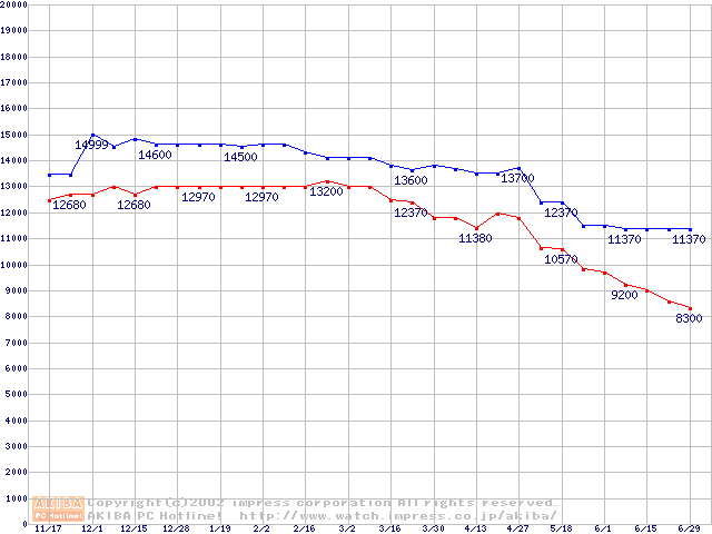 | [↑前グラフ]: | Socket A (Palomino,PGA,FSB 266MHz,L2 256KB)の最安値推移 |