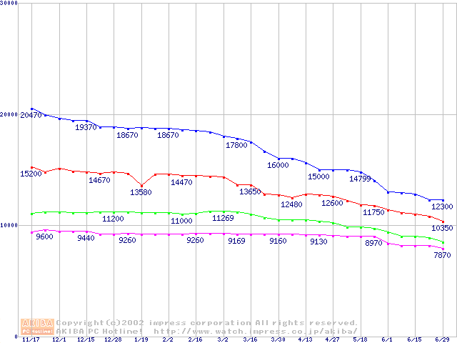 | [↑前グラフ]: | DiamondMax Plus D740X (7200rpm,UltraATA/133,40GB/Platter,流体軸受)の最安値推移 |