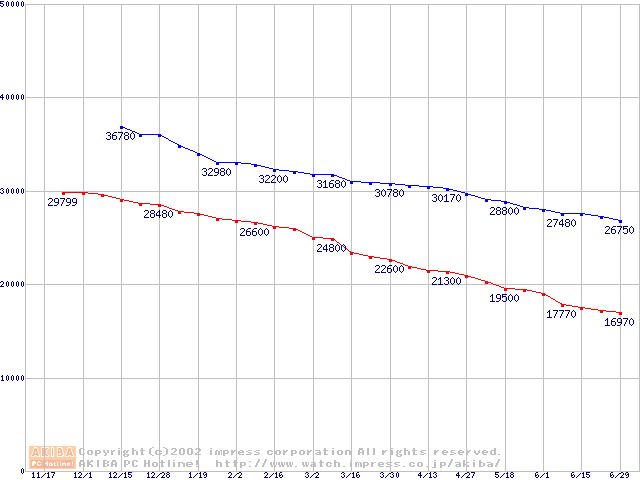 | [↑前グラフ]: | DiamondMax Plus D740X (7200rpm,UltraATA/133,40GB/Platter)の最安値推移 |
