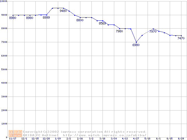 | [↑前グラフ]: | DiamondMax D540X (5400rpm,UltraATA/100,40GB/Platter)の最安値推移 |