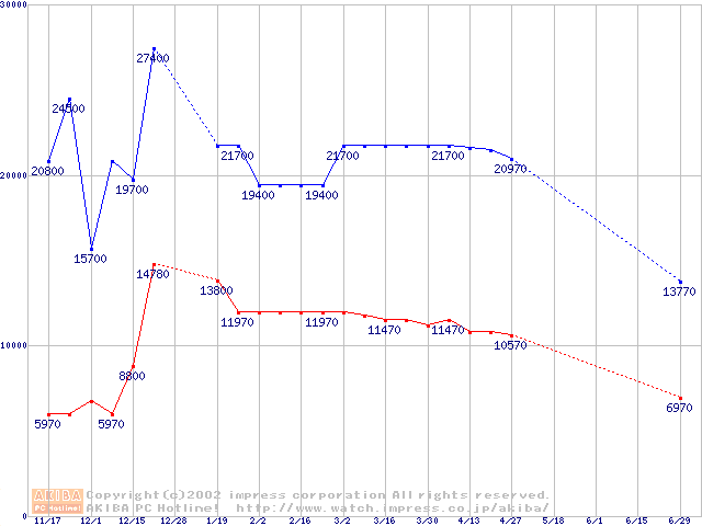 | [↓次グラフ]: | PC2700(DDR333) DDR SDRAM DIMM ECC対応 Registeredタイプの最安値推移 |