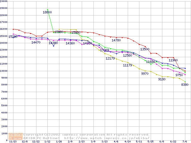 | [↑前グラフ]: | HDD 40GB~50GB未満(7200rpmクラス)の最安値推移 |