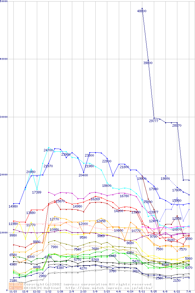 HDD 100GB以上(7200rpmクラス)の最安値推移