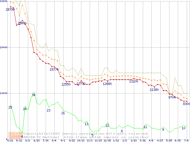 Socket A (Thunderbird,PGA,FSB 266MHz,L2 256KB)の最安値推移