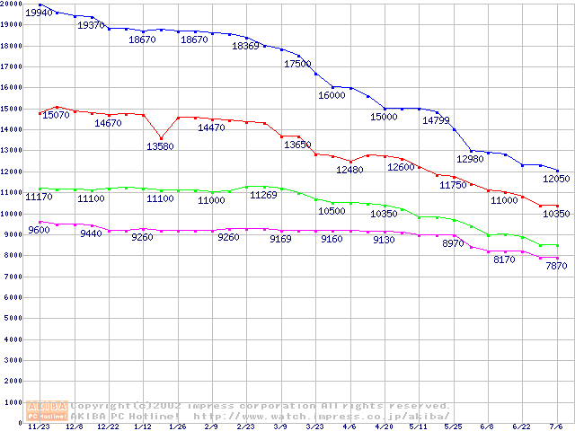 | [↑前グラフ]: | DiamondMax Plus D740X (7200rpm,UltraATA/133,40GB/Platter,流体軸受)の最安値推移 |