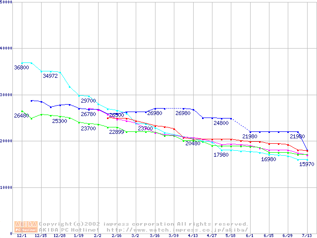 | [↑前グラフ]: | 2.5インチHDD 30GB~40GB未満(9.5mm厚)の最安値推移 |