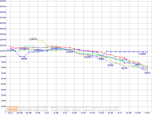 | [↑前グラフ]: | HDD 20GB~30GB未満(7200rpmクラス)の最安値推移 |