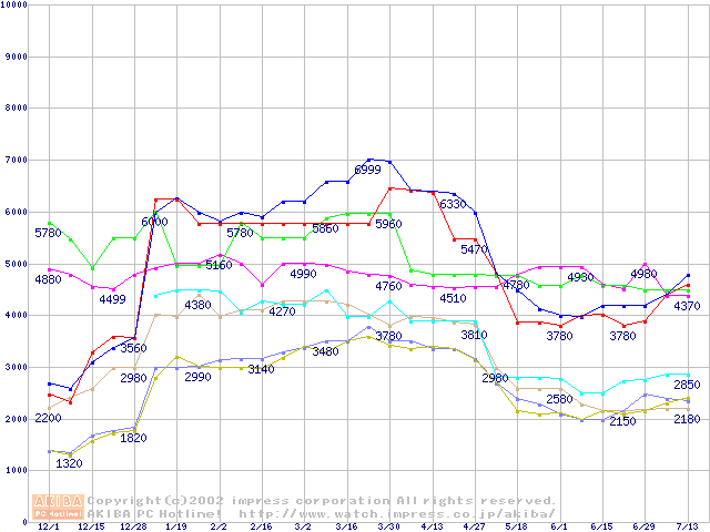 メモリ主要製品(最安値5千円~1万円未満)の最安値推移