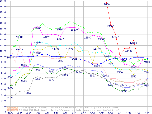 メモリ主要製品(最安値1万円以上)の最安値推移