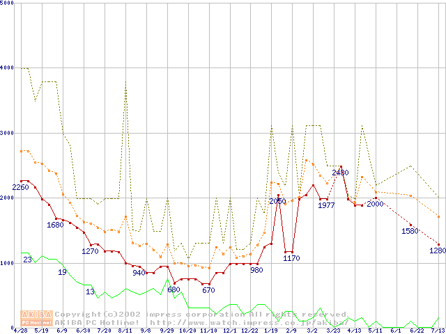 PC100 SDRAM DIMM CasLatency=2の最安値推移