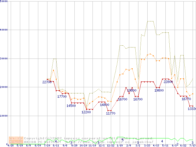PC100 SDRAM DIMM CasLatency=2 ECC対応 Registeredタイプの最安値推移