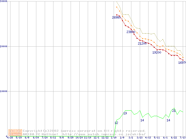 2.5インチHDD主要製品(最安値1万5千円~2万円未満)の最安値推移