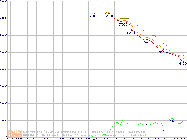 Travelstar 60GH (12.5mm,5400rpm,UltraATA/100,15GB/Platter,2MB,流体軸受)の最安値推移