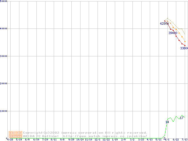 Travelstar 40GNX (9.5mm,5400rpm,UltraATA/100,20GB/Platter,8MB,流体軸受)の最安値推移