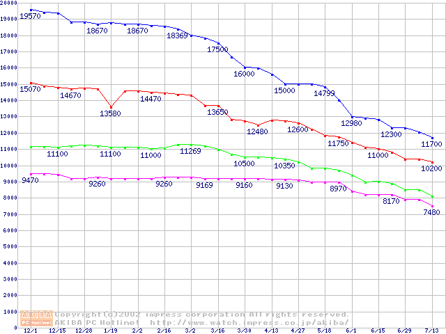 | [↑前グラフ]: | DiamondMax Plus D740X (7200rpm,UltraATA/133,40GB/Platter,流体軸受)の最安値推移 |