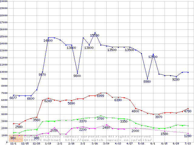 | [↓次グラフ]: | PC100 SDRAM DIMM CasLatency=2 ECC対応の最安値推移 |