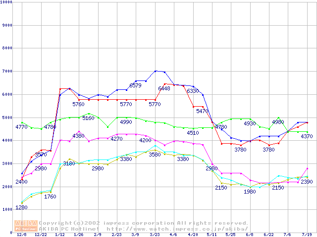 メモリ主要製品(最安値5千円~1万円未満)の最安値推移