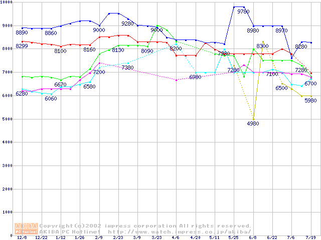 | [↑前グラフ]: | Socket 370 (FC-PGA2,FSB 100MHz,L2 256KB)の最安値推移 |