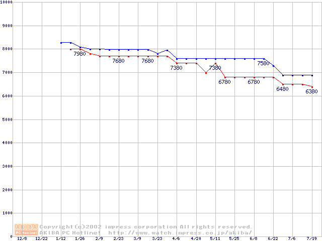 | [↓次グラフ]: | Deskstar 120GXP (7200rpm,UltraATA/100 2MB)の最安値推移 |