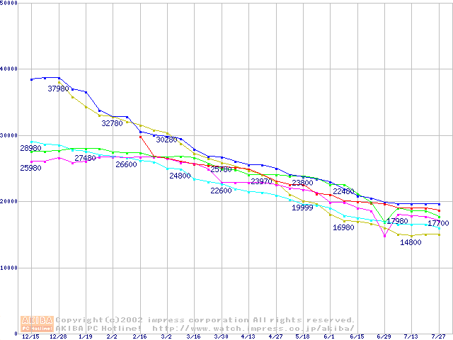 | [↓次グラフ]: | HDD主要製品(最安値2万円以上)の最安値推移 |