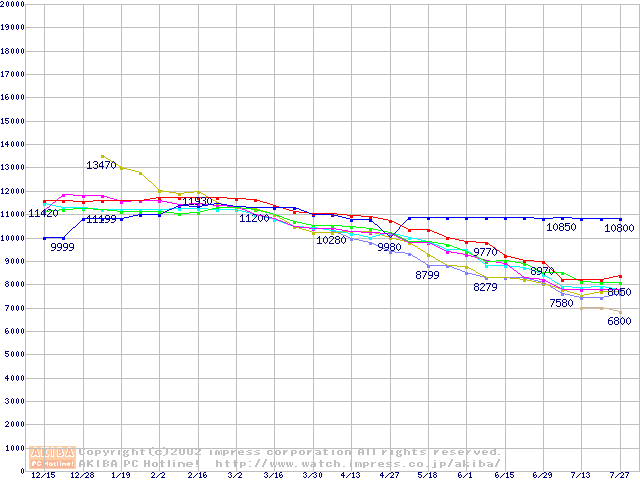 | [↑前グラフ]: | HDD 20GB~30GB未満(7200rpmクラス)の最安値推移 |