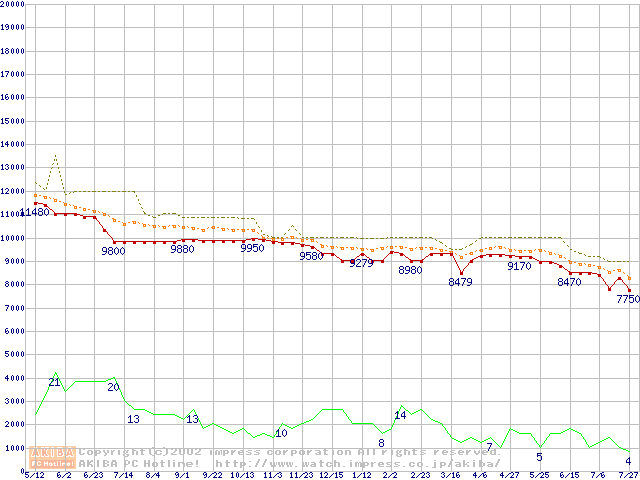 WD Caviar (7200rpm,UltraATA/100,20GB/Platter)の最安値推移